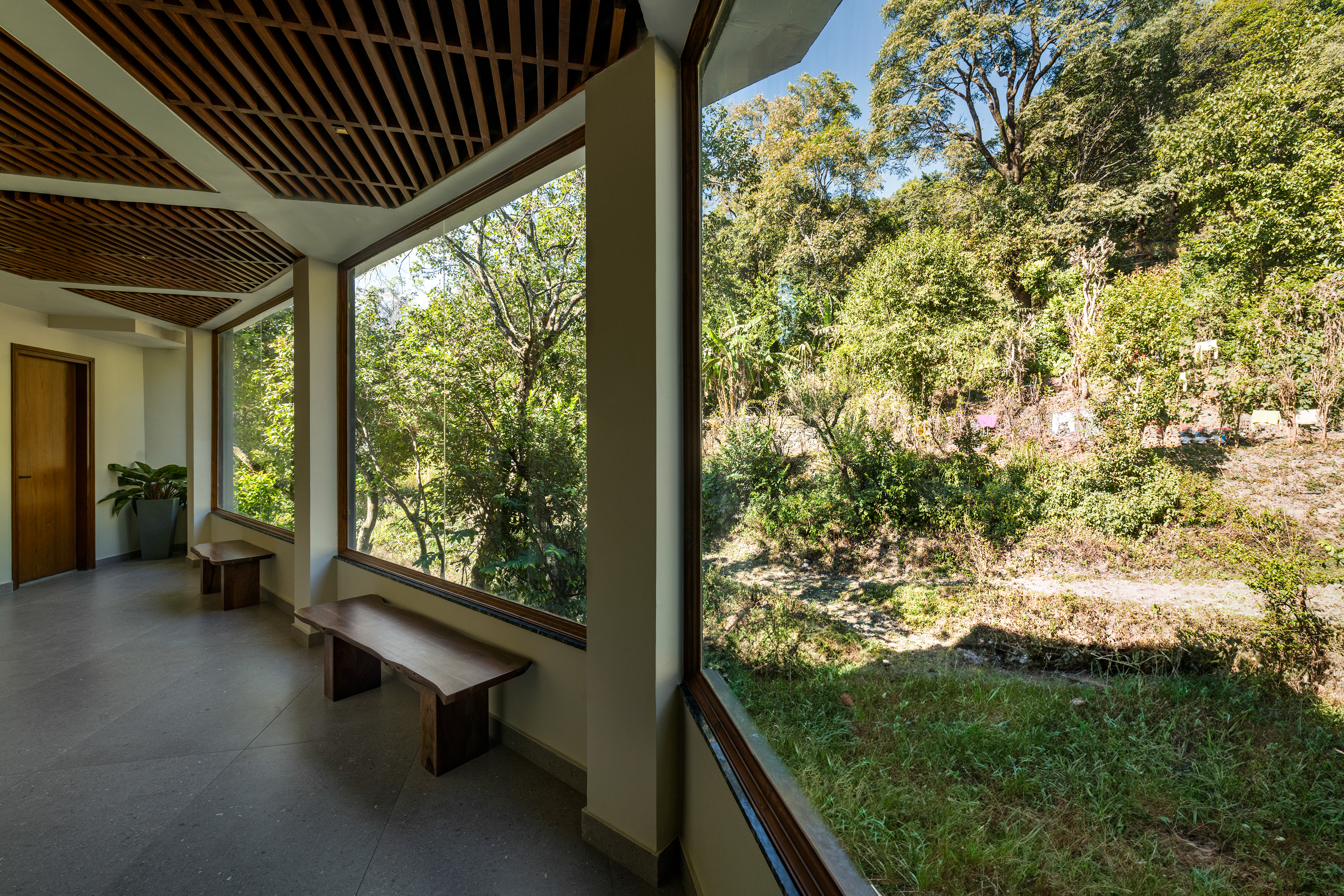 To complement the cool, breezy climate of Bhimtal, the interiors are heavily defined by the use of natural wood. The wooden accents and furniture introduce a "raw warmth" to the space, immediately infusing the reception area with a cozy, inviting ambiance.