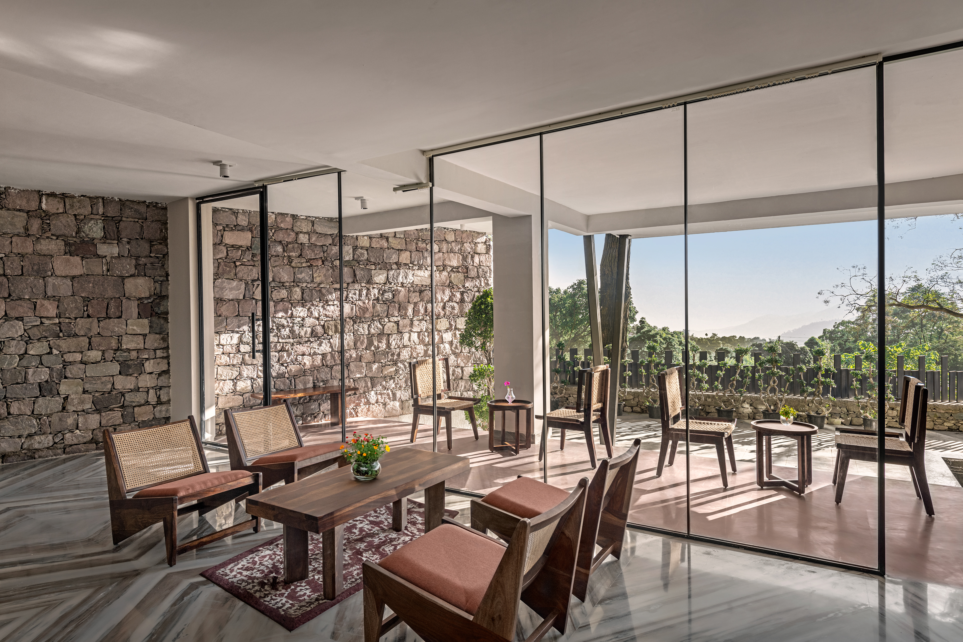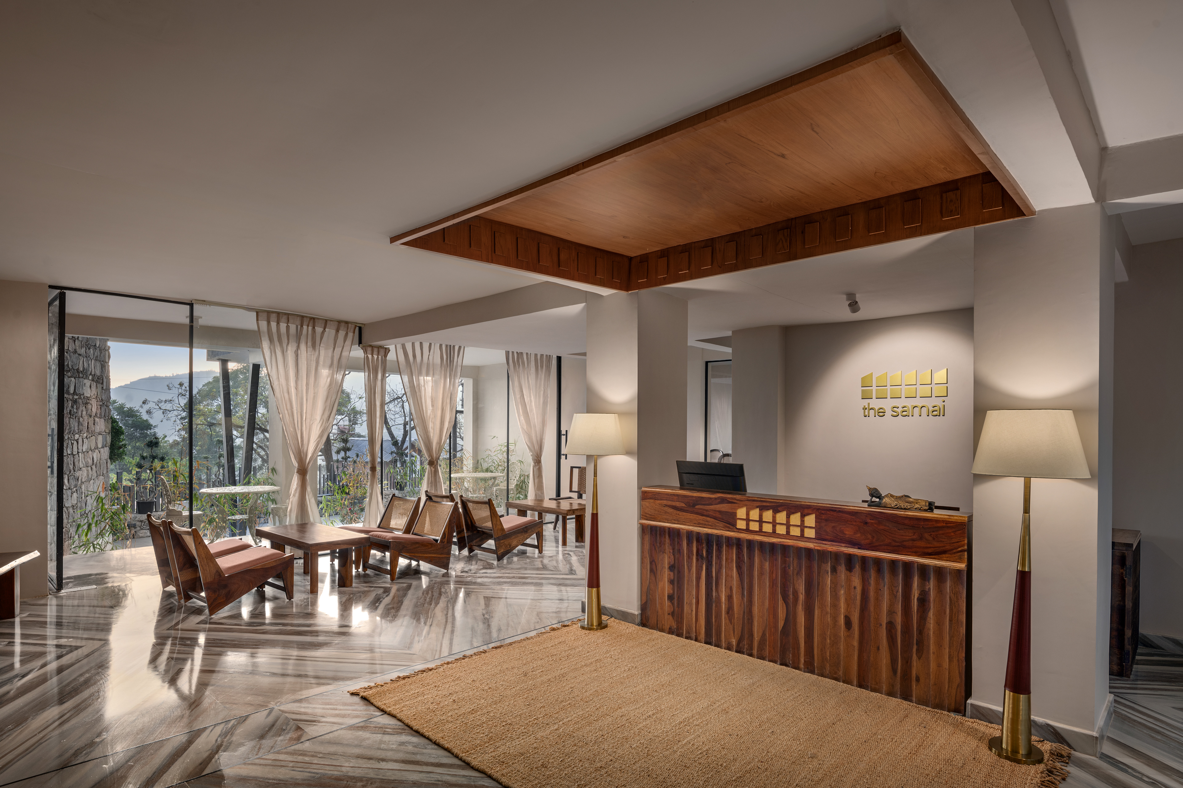 The core design philosophy of The Samai hinges on a harmonious connection between the built environment and the majestic Uttarakhand landscape. This is most evident in the property’s reception and lounge area, which serves as the guest’s first handshake with the hotel.